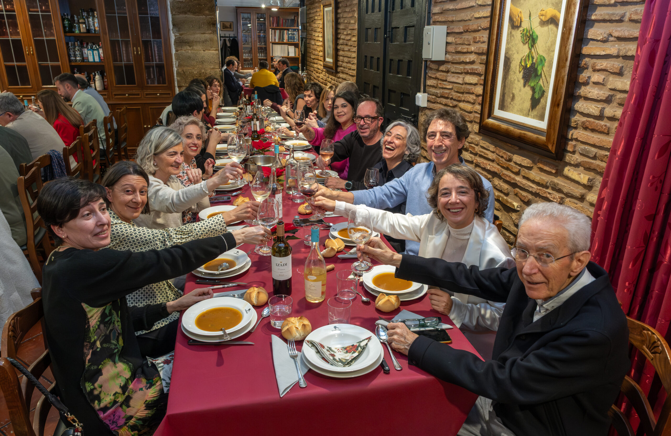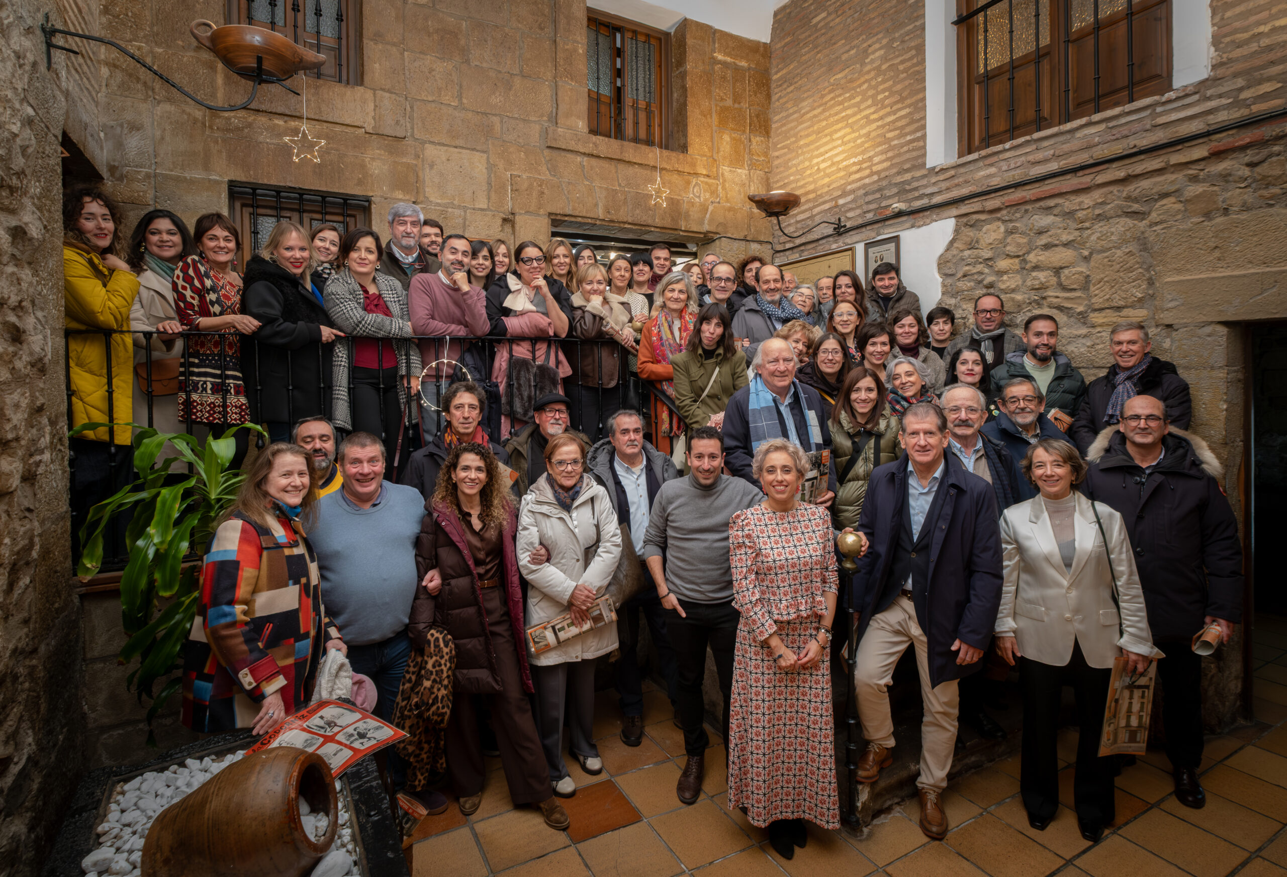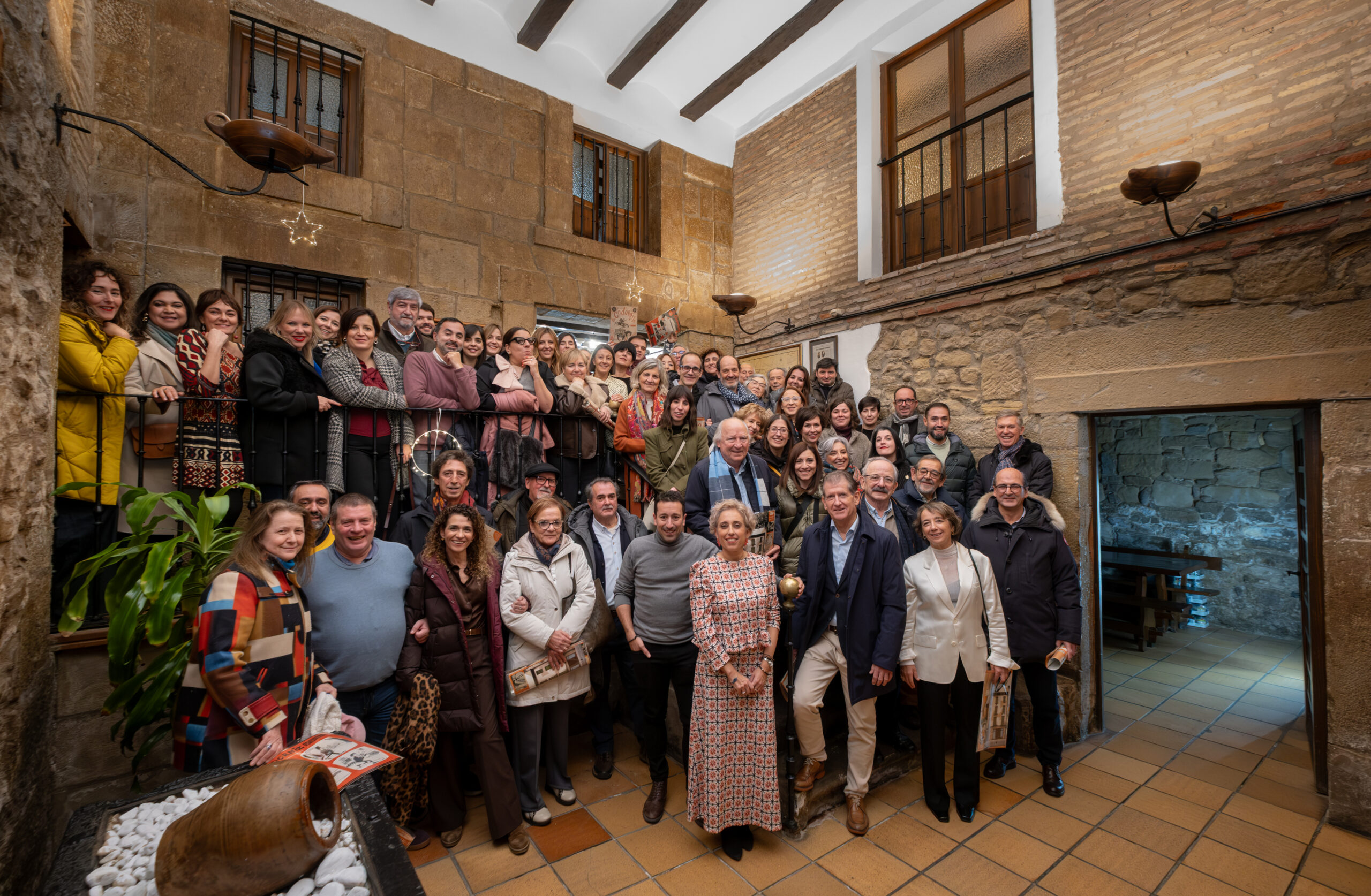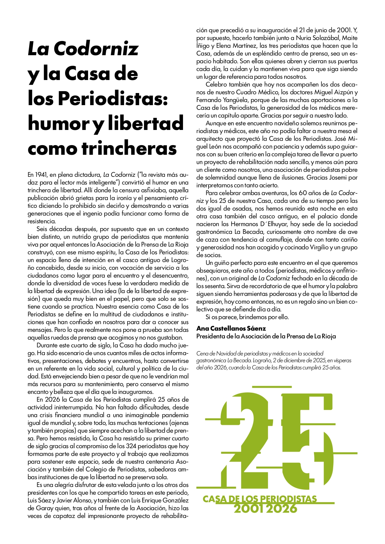 Anoche la Sociedad Gastronómica La Becada, ubicada en el edificio del siglo XVIII de la calle Santiago que fue hogar de los hermanos D’Elhuyar, acogió la cena de Navidad de los periodistas riojanos con su Cuadro Médico, un acto que sirvió de inicio a los diversos actos que se celebrarán a lo largo de 2026 para conmemorar el 25 aniversario de la Casa de los Periodistas. En esta ocasión disfrutamos de un menú tradicional de Navidad y el servicio de la cena estuvo a cargo de un grupo de excelentes cocineros de La Becada, sociedad que se inauguró en 1941, sesenta años antes que nuestra Casa. El vino de la cena fue gentileza de Bodegas Izadi. Cada uno de los asistentes fue obsequiado con un ejemplar original de la revista La Codorniz que, en plena dictadura, convirtió el humor en una trinchera de libertad.