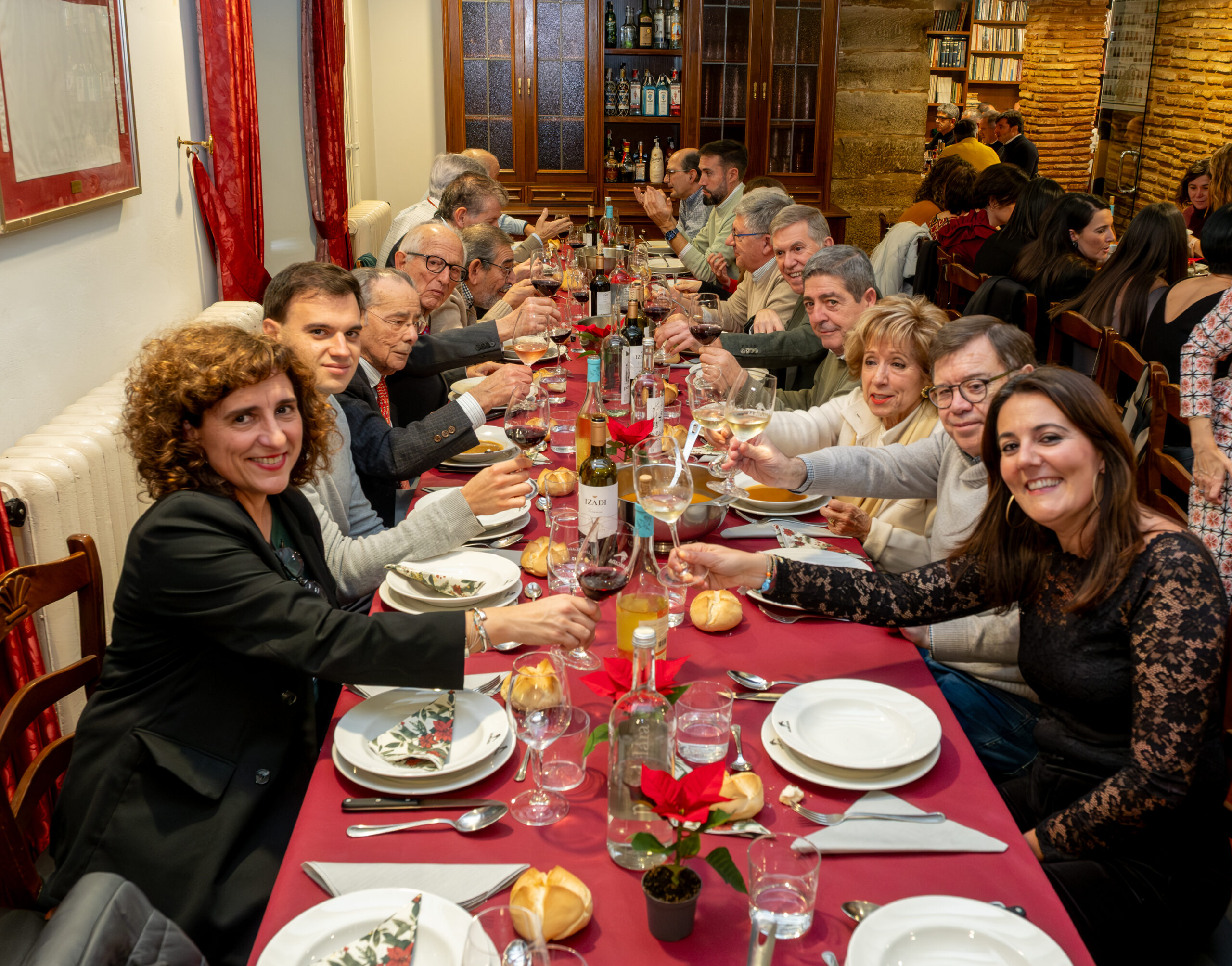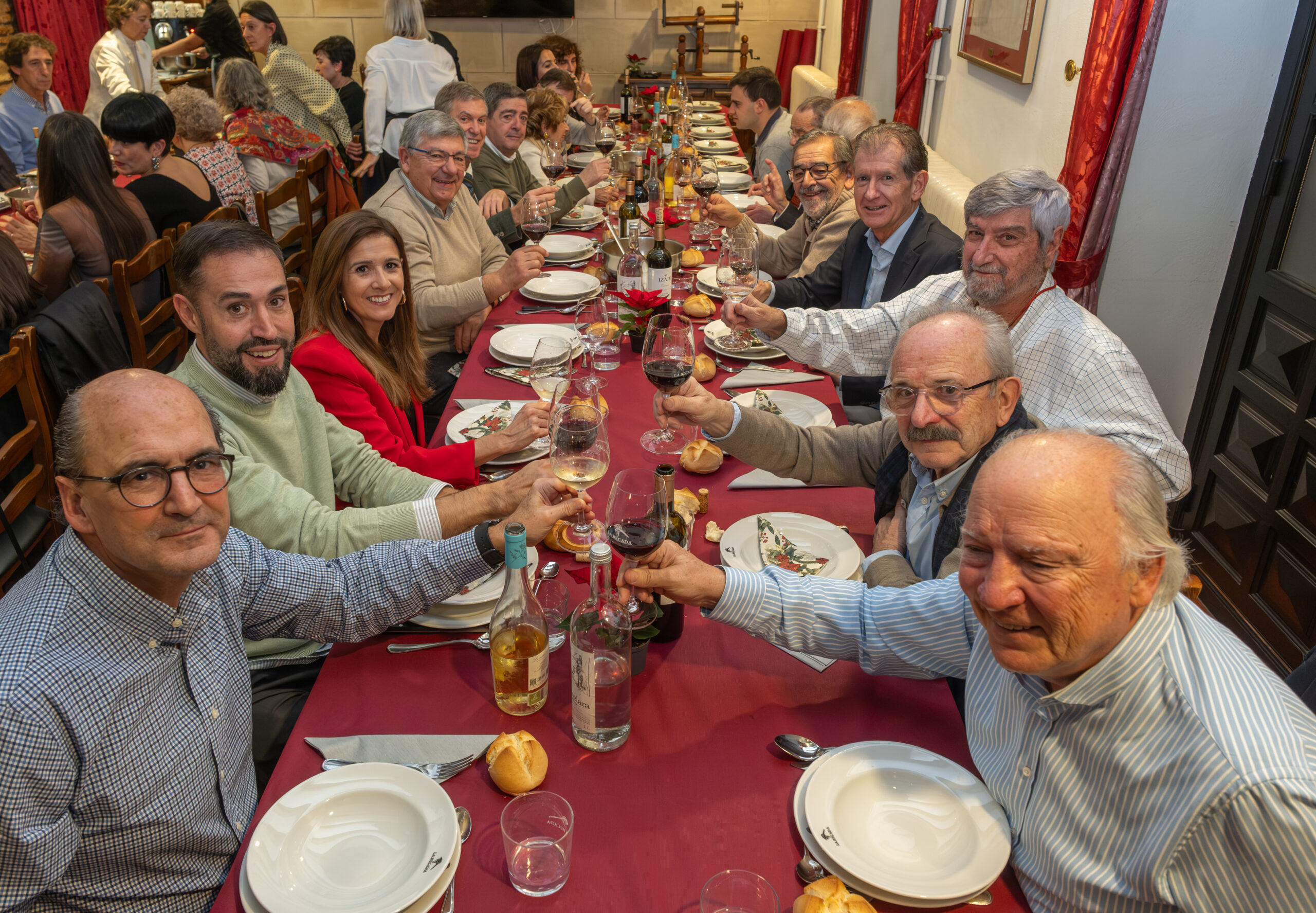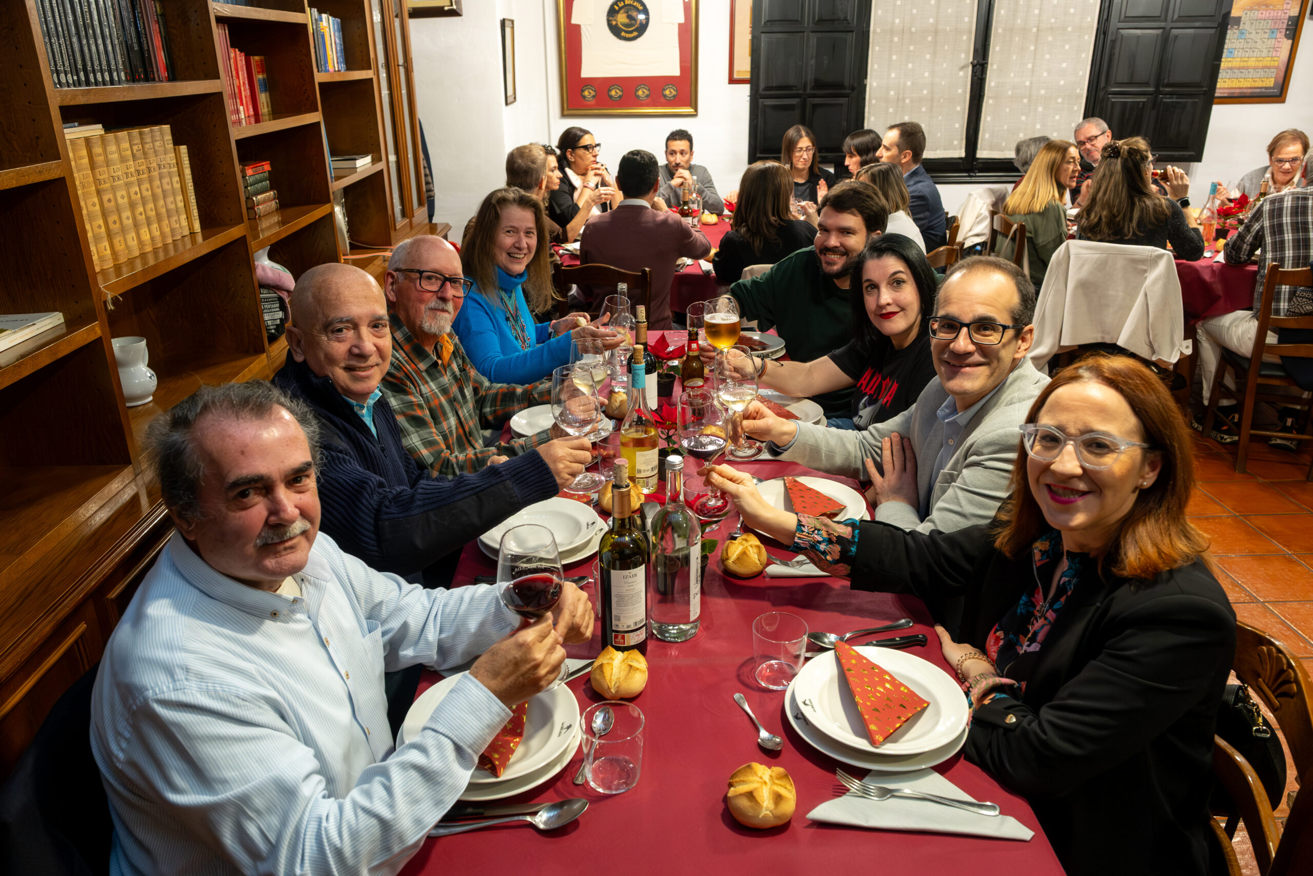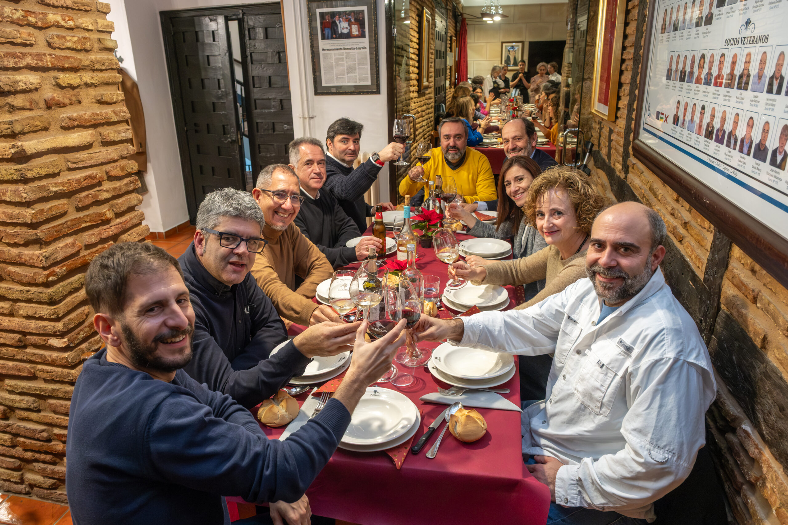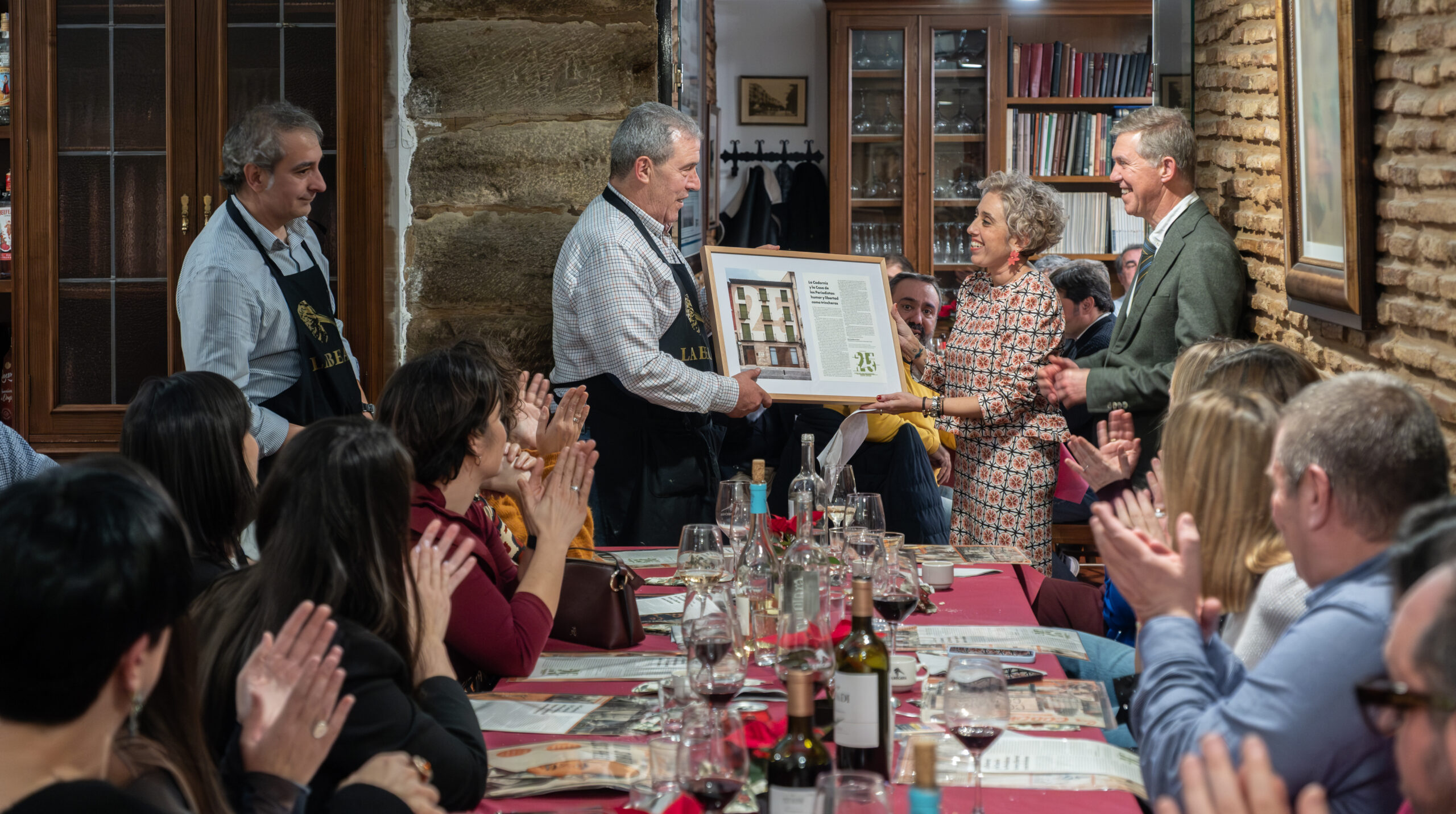 Anoche la Sociedad Gastronómica La Becada, ubicada en el edificio del siglo XVIII de la calle Santiago que fue hogar de los hermanos D’Elhuyar, acogió la cena de Navidad de los periodistas riojanos con su Cuadro Médico, un acto que sirvió de inicio a los diversos actos que se celebrarán a lo largo de 2026 para conmemorar el 25 aniversario de la Casa de los Periodistas. En esta ocasión disfrutamos de un menú tradicional de Navidad y el servicio de la cena estuvo a cargo de un grupo de excelentes cocineros de La Becada, sociedad que se inauguró en 1941, sesenta años antes que nuestra Casa. El vino de la cena fue gentileza de Bodegas Izadi. Cada uno de los asistentes fue obsequiado con un ejemplar original de la revista La Codorniz que, en plena dictadura, convirtió el humor en una trinchera de libertad.